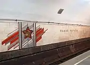 Станція з вузькими пілонами. Інтер'єр станції цілком відповідає попередній назві: облицьовані червоною смальтою пілони з торцями з іржостійкої сталі, торець центрального залу з зображенням червоноармійця, колійні стіни з червоними зірками — емблемами Червоної Армії та Радянської Армії на дверцятах кабельних шаф на колійних стінах. 2015 року всі мозаїчні панно приховано[2].