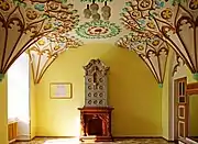Звідти тримаршеві сходи ведуть на другий поверх, де розмістилися голландські пічки з кахлями тонких малюнків. Ліплений декор стелі теж виконано в неоготичному стилі. За сходами — аванзал, де на стелі є велика розетка, схожа на розу готичних соборів. У кожній з її 8 частин розміщено геральдичний щит із гербом гілок родини. З аванзали проходили у найбільший зал палацу, прикрашеному ліпним карнизом. В анфіладі йде далі кругла вітальня з ліпним фризом із гірлянд та маскаронів сатирів, є також шаблі та перначі.