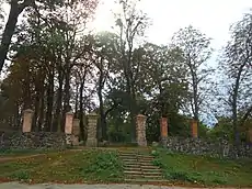 Відразу за брамою, праворуч — фруктовий сад, відокремлений невеликим прошарком паркової рослинності; одразу за величезними та кремезними старими деревами біжать углиб здичавілих рослин дві дороги-алеї. Ліворуч — пряма, обсаджена кінськими каштанами, дугою в'ється вона понад яром, що заріс деревами. Яку б алею не вибрали, обидві підходять із півдня до галявини, що розкривається в бік палацу. З боків галявини — кілька величезних сріблястих тополь зі стовбурами у 4-5 обхватів.