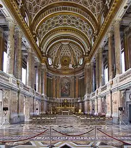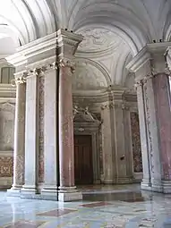 До найкращих зразків архітектури італійського бароко належить і зала зі сходами у середхресті комплексу. Пілони, пілястри і сходинки з балюстрадами створюють дивовижну картину казкового палацу, котрі створювали лише на умовних, фантастичних декораціях у італійських барокових виставах. Міць пілонів середхрестя мала підтримувати підбанник і купол, котрі не були вибудовані. Тому конструкція мурів у важливих ділянках споруди досягла п'яти з половиною метрів завтовшки.