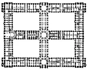 Палац спроєктований та вибудований у вигляді видовженого прямокутника без помітних ризалітів. Внутрішній простір розділений хрестоподібними корпусами на чотири видовжені та прямокутні двори.