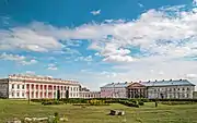 Старий палац — головне приміщення ансамблю, на 2 поверхи. Фасад палацу на парадний двір (курдонер) має відкриту лоджію в 10 колон іонійського ордеру. Будівля мала сполучення з бічними флігелями через заокруглені галереї, одна з яких (ліворуч) зруйнована до підмурків. Великий за розмірами ансамбль за поземним планом нагадував літеру П, відкриту на місто. Трохи краще збережений Флігель праворуч має наскрізну арку (подібна у флігеля ліворуч закладена.) Наскрізні арки прикрашені трикутними фронтонами, в тимпанах яких горельєфи з військовими атрибутами.