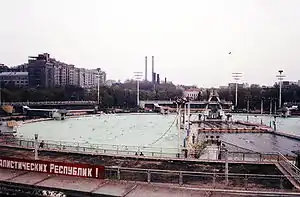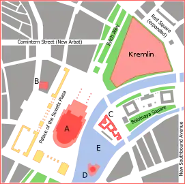 Пов'язані проєкти. Фундамент першого Палацу Рад після війни регулярно затоплювало дощами, що можливо посприяло його офіційному перетворенню на басейн[33]. У 1958—1960 роках у фундаменті був створений найбільший в світі відкритий зимовий плавальний басейн «Москва» (він займав площу Великого залу). Після розпаду СРСР, в 1990-х роках басейн був закритий, а на його місці в 1994 році почалося будівництво нового Храму Христа Спасителя, що візуально повторює старий. Його було завершено та відкрито в останній день 1999 року[34][35].