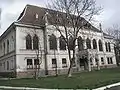 Осібно розташована споруда. Головний фасад розвернутий на південь, в бік скверу у глибині ділянки. Цегляна, тинькована, двоповерхова будівля, на плані — прямокутної форми. Високий дах має два ряди люкарн.