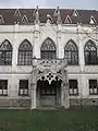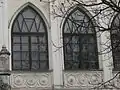 Головний фасад виділений ризалітом з акцентом неоґотичного портика на осі. Поверхи різної висоти. Вікна другого поверху завершені стрілчастими арками, на першому поверсі — вікна прямокутні. Над ризалітом встановлено фіали. Над фасадом — сильно винесений карниз.