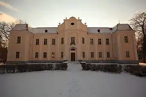 Будівлі: палац, курдонер, пейзажний парк, брама зі скульптурами, кухня, оранжерея, колишні стайні та візовня, мурований паркан у стилі рококо | ||||