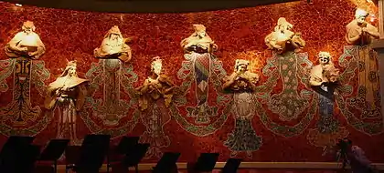 Сцена обмежена півкруглою стіною, на якій є вісімнадцять модерністських муз. Музи одягнені у національний одяг, в руках у них різні інструменти. Їхні торси і голови, вирізьблені як скульптури, в той час як нижні частини тіл — кольорові мозаїки. Це створює враження ніби вони танцюючи виходять зі стіни. Усі музи грають на різних музичних інструментах. Тло стіни сцени зроблене з червоної плитки.
