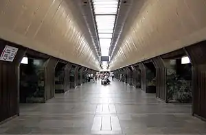 Станція глибокого закладення з колонами великого перерізу. Незвична конструкція сприяла створенню незвичного вирішення склепіння у центральному залі — вона не радіальна, а більш трапецевидна із заоваленими кутами. З цієї станції почалося широке використання алюмінію в оздобленні станцій метро. Колони облицьовані зеленим (на той час дуже незвичним) кубинським мармуром та алюмінієвим профілем. Світлові лінії з стандартних світильників практичні і органічно вписуються у загальний інтер'єр станції.