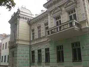 Двоповерховий, цегляний, тинькований, у плані прямокутний. Складається з двох частин: особняк початку XX ст. та прибудова 1970-х рр. Особняк виконаний з використанням елементів бароко. У асиметричній об'ємно-просторовій композиції вирізняються бічний ризаліт великого виносу та бічна розкріповка. Ризаліт має парадний вхід, на рівні другого поверху підкреслений канелюрованими колонами коринфського ордеру та увінчаний чотиригранним шатром із люкарною. Такими само колонами фланкована розкріповка, яка має балкон та завершується аттиком із люкарною. Перший поверх будинку рустований, другий — багато декорований ліпними деталями, серед яких вирізняються кронштейни карнизу, наріжні вази на аттиках, лучкові сандрики, що спираються на канелюровані колони (у оздобленні вікон ризаліту та розкріповки), рослинний орнамент підвіконних ніш тощо. Прибудова виконана з дотримуванням загального стилю старої будівлі, але майже не має елементів оздоблювання. Архітектурний декор підкреслено пофарбуванням.