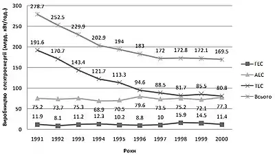 При наявності п'яти атомних електростанцій потужністю 11800 МВт (на 01.01.2000 р.), відіграє значну роль у забезпеченні країни електроенергією. Його частка у виробництві електроенергії, в порівнянні з іншими енергоносіями, постійно зростає. Так у 2000 р. АЕС виробили 45,1 % електроенергії (рис. 3, 4) і майже зрівнялась з часткою теплових електростанцій, в яких 19 млн кВт потужностей із 36 вимагають ремонту чи реконструкції.