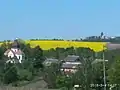 Вигляд на місцеву церкву Архистратига Михаїла (на задньому плані — «Ксьондзове поле» засіяне ріпаком та монастир походження дерева Хреста Господнього у Підкамені)