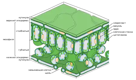 Під палісадним мезофілом розташовуються клітини губчастого мезофілу, які також активно фотосинтезують. Ці клітини мають неправильну форму, з великою кількістю повітроносних порожнин, які збільшують проникність листка для вуглекислого газу.