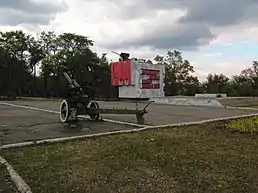 На верхній площадці куба встановлено 57-міліметрову протитанкову гармату радянського виробництва. В 15 м від кубу стоїть 122-міліметрова гаубиця. В 10 м від гаубиці знаходиться 37-міліметрова зенітна гармата. На площадці, де встановлено моноліт кубу, зроблено горизонтальну бетонну платформу розмірами 3х3х0,6 м. Зверху вона облицьована 6-ма плитами червоного граніту. На них напис російською мовою: