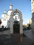 Пам'ятний знак з видом на Воскресенську церкву