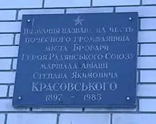 | Степану Красовському, герою СРСР, почесному громадянину Броварів | до 16 листопада 2016 року[40] | на будинку по вулиці Сергія Москаленка, 2 | 50.5094523° пн. ш. 30.8202901° сх. д. | ![]() | Як зазначено на дошці, вона встановлена по вулиці, яка була названа на честь Степана Красовського. | |