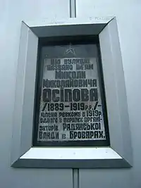 | Миколі Осіпову, члену ревкому, радянському окупанту | поблизу початку вулиці Переяславський шлях; на будинку по вулиці Ярослава Мудрого, 8 | 50°29′57″ пн. ш. 30°46′28″ сх. д. | ![]() | Установлено на честь більшовика, одного з перших організаторів окупаційної радянської влади у Броварах. | |