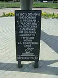 | Страченим броварцям, прихильним до СРСР | 22 вересня 1989 року[23] | на вулиці Київській, 153; на будівлі школи № 1 | 50.4991945° пн. ш. 30.7695374° сх. д. | ![]() | Установлено на будівлі школи, де, згідно із інформації на табличці, у 1942 році німецькі окупанти стратили мешканців Броварів, прихильних до СРСР, а саме: Дмитра Білецького, Петра Верещагіна, Миколу Дятла, Івана Тонкого та Павла Щербака. |