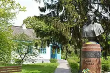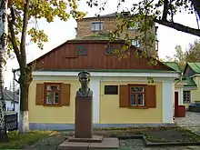 скульпт. Володимир Сколоздра | бронзове погруддя на мармуровій колоні | З 1882 року сім’я Українки оселилась тут на постійне мешкання, Леся жила до кінця 1896, далі — наїздами. | |