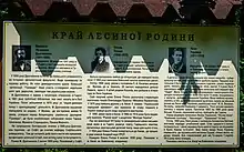 | 5 | Великі Бережці, Тернопільська обл. | 1987 | (світлина) | На честь перебування Українки в червні–липні 1907 р. в своєї подруги – вчительки Марії Бєляєвої (Биковської). | ||||