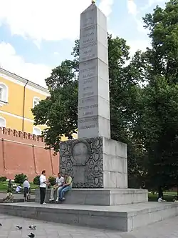 | Обеліск у Олександрівському саді / Революційним мислителям і діячам боротьби за звільнення трудівників / «Романовський обеліск» | у Олександрівському саді | Початково обеліск було встановлено на честь 300-річчя російської царської династії Романових 1914 року, але 1918 року за вказівкою Леніна обеліск переобладнали на честь революційних діячів та мислителів. Автор — архітектор С. А. Власьєв. Від 1966 року на сучасному місці розташування[3]. | ![]() | |