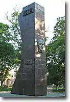 Автори: скульптори — Іван Білокур, Володимир Потребенко, В. Л. Шкуропат, архітектори — Г. П. Сікула, Ю. П. Тарасов. Спочатку був встановлений на розі вул. Леніна (Соборна) та Жовтневої революції, 1959 року переміщений на сучасне місце перебування. Демонтований відповідно до рішення міської ради від 17 липня 2015 року. |