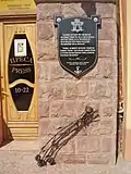 На кам'яній дошці — напис (українською та німецькою мовами): «Чернівці — на півдорозі між Києвом і Бухарестом, Краковом і Одесою — були таємною столицею Європи, де тротуари підмітали букетами троянд, а книгарень було більше, ніж пекарень». Інститут розвитку міста Чернівці. 2008. |