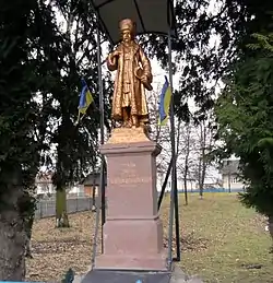 .По уставленню гостий і народу знято з пам’ятника заслону, і очам явилась гарно з білого каменя вирізблена статуя Тараса Шевченка у весь ріст, у довгій чамарі з традиційною шапкою на голові, уміщена на підмурованю з білого каменя і високім цокли
