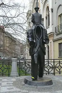 Пам'ятник знаменитому письменникові Францу встановлений 2003 року в середмісті Праги, на місці, де колись проходила межа між єврейським кварталом Йозефів, де народився Франц Кафка, та християнським Старим Містом. Пам'ятник являє собою фігуру письменника, що гордо сидить на гігантському костюмі, в якому відсутній той, хто його, здавалося б, має носити. На перший погляд, скульптура абсолютно абсурдна. Але так воно і має бути. Художник тим самим хотів зобразити ірраціональний, що не піддається логічному поясненню художній світ Кафки.[джерело?]