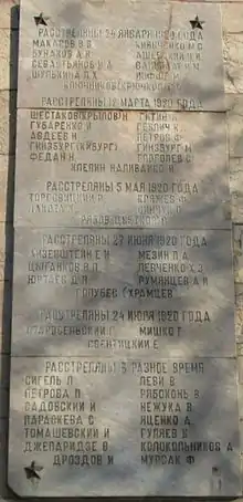 - Страчені 26—27 червня 1920 року: Айзенштейн Е. І., Циганков В. П., Юртаєв Д. Я., Мезін П. А., Левченко Х. З., Румянцев А. І., Голубєв П. (Храмцев В.).