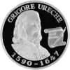 | 415-річчя з дня народження Григора Уреке | 50 | 29 серпня 2005 | срібло, 925 | 16,5 | 30 | Центральним зображенням монети є портрет Григора Уреке. Праворуч від портрета зображено листок паперу з написом «Letopisetul Tarii Moldovei» і перо. По колу є написи: «GRIGORE URECHE» (зверху), «1590—1647» — роки життя (знизу). | ![]() | |