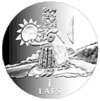 Небеса Реверс: жіноча фігура, Сонце і Місяць на тлі стилізованого латвійського пейзажу. |