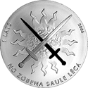Аверс: номінал, рік випуску, схрещені мечі на тлі Сонця, напис на латис. NO ZOBENA SAULE LĒCA. | ||