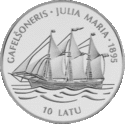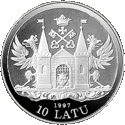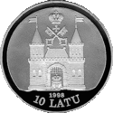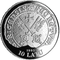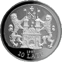 Монети номіналом 10 латів, виготовлені зі срібла 925 проби, мають діаметр 38,61 мм і масу 31,47 гр.