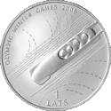 Аверс: номінал, рік випуску, три фігури латвійських бігунів в національних костюмах, напис на латис. 100 GADU OLIMPISKAJĀS SPĒLĒS - «100 років на Олімпійських іграх».