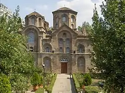 Церква побудована з цегли, що створює декоративний ефект (численні стрільчасті арки, оперізуючі храм зубчасті стрічки). Храм не має галереї, купол спирається на чотири колони в центральній частині храму, що має форму квадрата. Вівтарна частина має три апсиди (жертовник, вівтар, дияконник). На західній стороні храму — нава, що з'єднується з основною частиною храму через троє воріт. До нави примикає пізніша за часом спорудження галерея.
