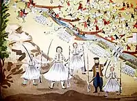 Відтак 1836 року Макріянніс звернувся до Зографоса, який був сільським іконописцем-самоуком, що працював у пост-візантійській традиції. До того ж як учасник війни він бачив на власні очі те, що Макріянніс хотів передати через пензель Зографоса. Для Макріянніса ж ці картини були не просто живописом, він не ставив собі за мету сприяти образотворчому мистецтву тих років. Більше того, сам Макріянніс не особливо був задоволений кінцевим естетичним результатом. Співпраця із Зографосом і його двома синами мала з точністю відобразити думки і бачення Макріяннісом Визвольної війни, ряд справжніх подій і конкретний символізм. Саме тому всі ці картини підписані так: «Задум Макріянніса — рука Панайотіса Зографоса».