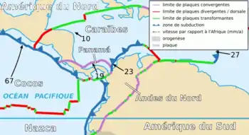 Має конвергентну границю з Карибською плитою. Трансформаційну границю з плитою Наска й Північноандською плитою. Зону субдукції з плитою Кокос.