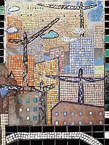 У мозаїчно-керамічному панно використовувалося поєднання керамічної плитки й кольорових цементів.