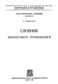 - Паночіні С. Словник біологічної термінології / Науково-дослідчий інститут мовознавства ВУАН. — Харків: Держ. вид-во «Радянська школа», 1931. — 89 с. — (Серія практичних словників. Випуск IV).