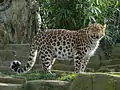 ![]() | пантера плямиста P. pardus | Довжина тіла 91–191 см; хвіст 51–110 см; вага 28–90 кг. Фоновий колір волосяного покриву від коричневого або світло-жовтого до червонувато-помаранчевого. Тіло вкрите чорними розетками, але на грудях, лапах і обличчі — суцільні чорні плями, а на хвості — кільця. Меланізм трапляється. | ![]() |