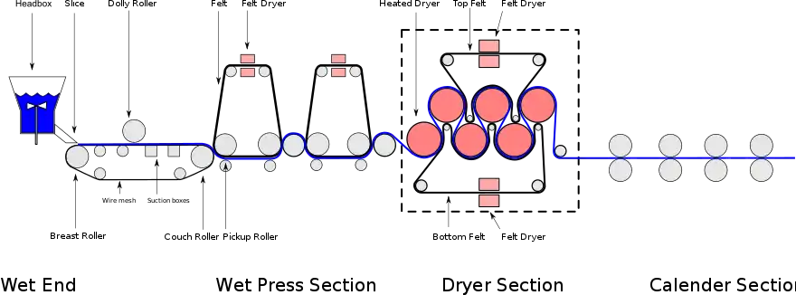 Машина для виробництва паперу — багатосекційний агрегат безперервної дії, на якому із волокнистої суспензії, що сильно розведена водою, одержують папір і деякі види картону.