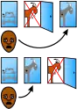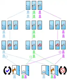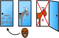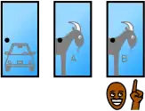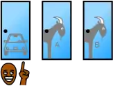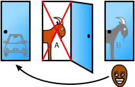 Гравець має однакові початкові шанси виграти машину, козу А або козу Б. Зміна вибору змінює результат на виграшний в 2/3 випадків. | |||||||||||||||||||||||||||