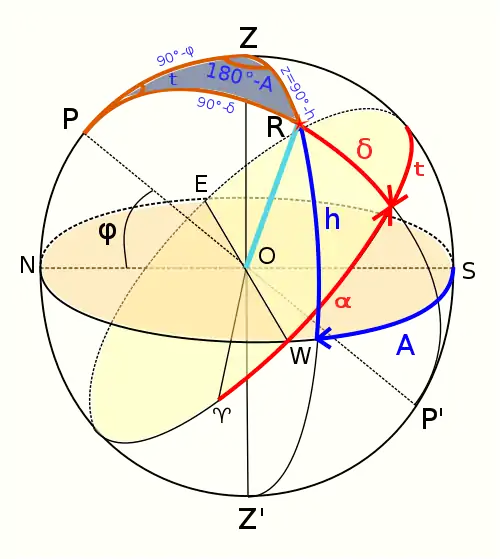 Кути трикутника в свою чергу: при вершині Z = 180 ° — A, де A — це азимут, при вершині P = t, тобто дорівнює годинному куту і третій кут, при світилі R, позначається q і називається паралактичним кутом.