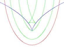 Еліпс (показано червоним), його еволюта (синім) і декілька паралельних кривих (зеленим).