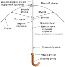 Уживане слово «зонтик» («парасоля», «козирок»)[10], «зонт» через російське посередництво походить від нід. zonnedek («сонячна парасолька»); первісною формою є «зонтик», потім внаслідок сприйняття його як зменшувальної форми з'явилася і «повна» форма «зонт»[11].