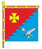 Квадратне полотнище, розділене хвилеподібно по діагоналі з нижнього кута від древка на два рівновеликі трикутні поля, у верхньому червоному жовтий хрест із розширеними кінцями. У нижньому синьому - перехрещені білі перо та пірнач, під якими жовтий каламар.