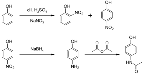 Парацетамол одержують ацилюванням 4-амінофенолу, який утворюється при відновленні 4-нітрофенолу, отриманого нітруванням фенолу:[5]