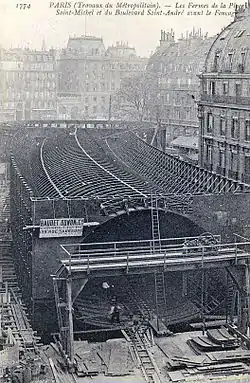 Будівництво четвертої лінії (1905—1910) було найбільш очікуваним та видовищним, адже вона мала перетинати Сену під землею. Для цього на земній поверхні були спорудженні криті металеві конструкції (кесони), які потім відбуксирували на місце призначення та занурили у воду. В нижній частині кесонів була камера для робітників, які видобували річний ґрунт на поверхню, таким чином поглиблюючи сам кесон у ґрунт. Для північного рукава Сени знадобилося три кесони, а для південного — два. Станції Сен-Мішель та Сіте також були зібрані на поверхні, а потім заглибленні.
