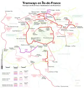 Сучасна трамвайна мережа Іль-де-Франса складається з десяти ліній, що використовують різні технології будови колії й слабо сполучені між собою. Службові сполучні гілки прокладені між лініями Т1 і Т8 (біля зупинки «Гар де Сен-Дені») та між лініями Т3а і Т3b (на кінцевій «Порт-де-Венсен»). Ширина колії на всіх лініях зі стандартним ходом — 1435 мм, на лініях із шинним ходом застосовується одна напрямна рейка посередині бетонної доріжки.