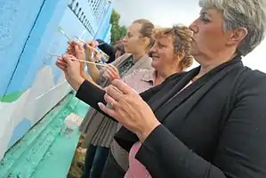 Оселівчани розмальовують огорожу.
